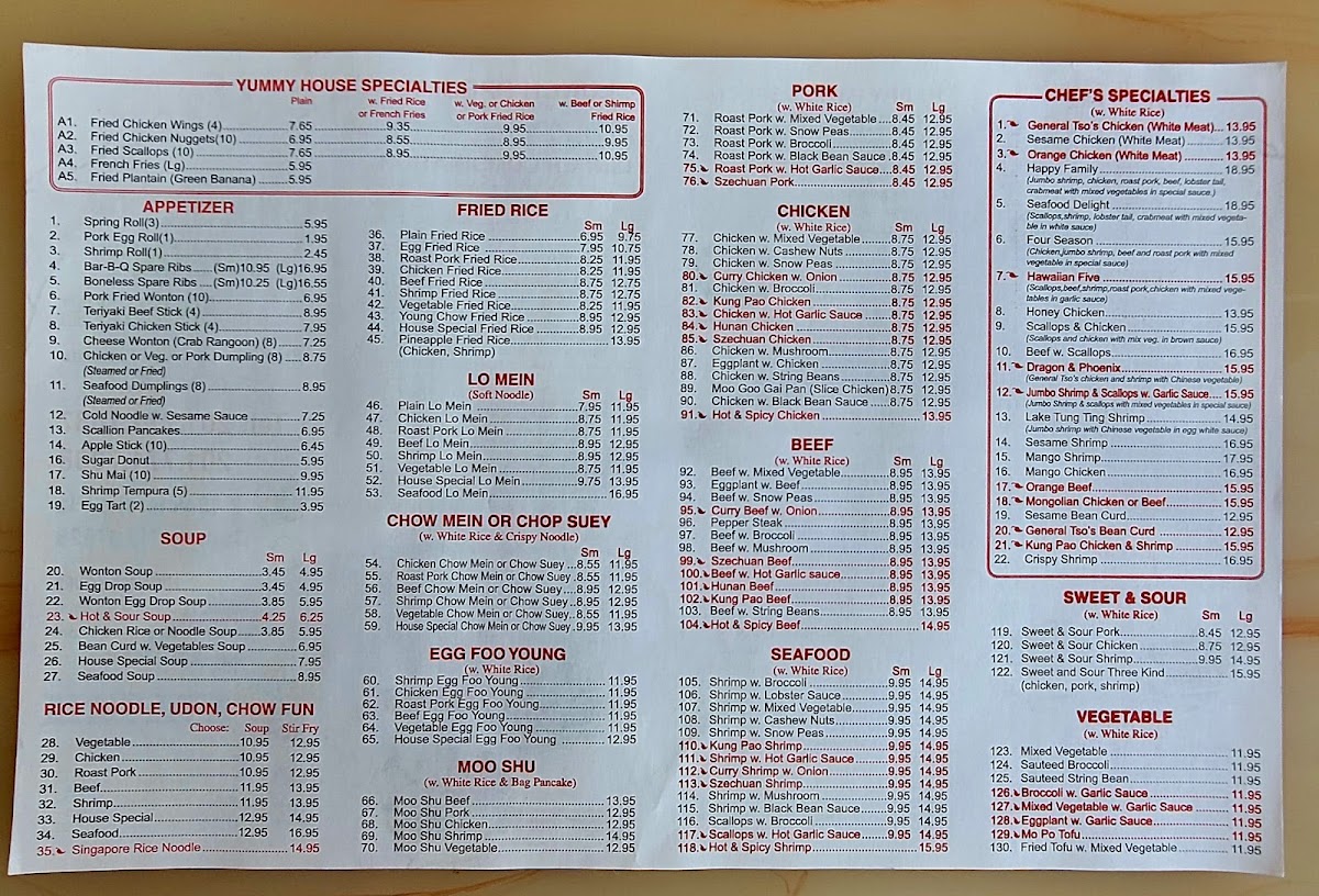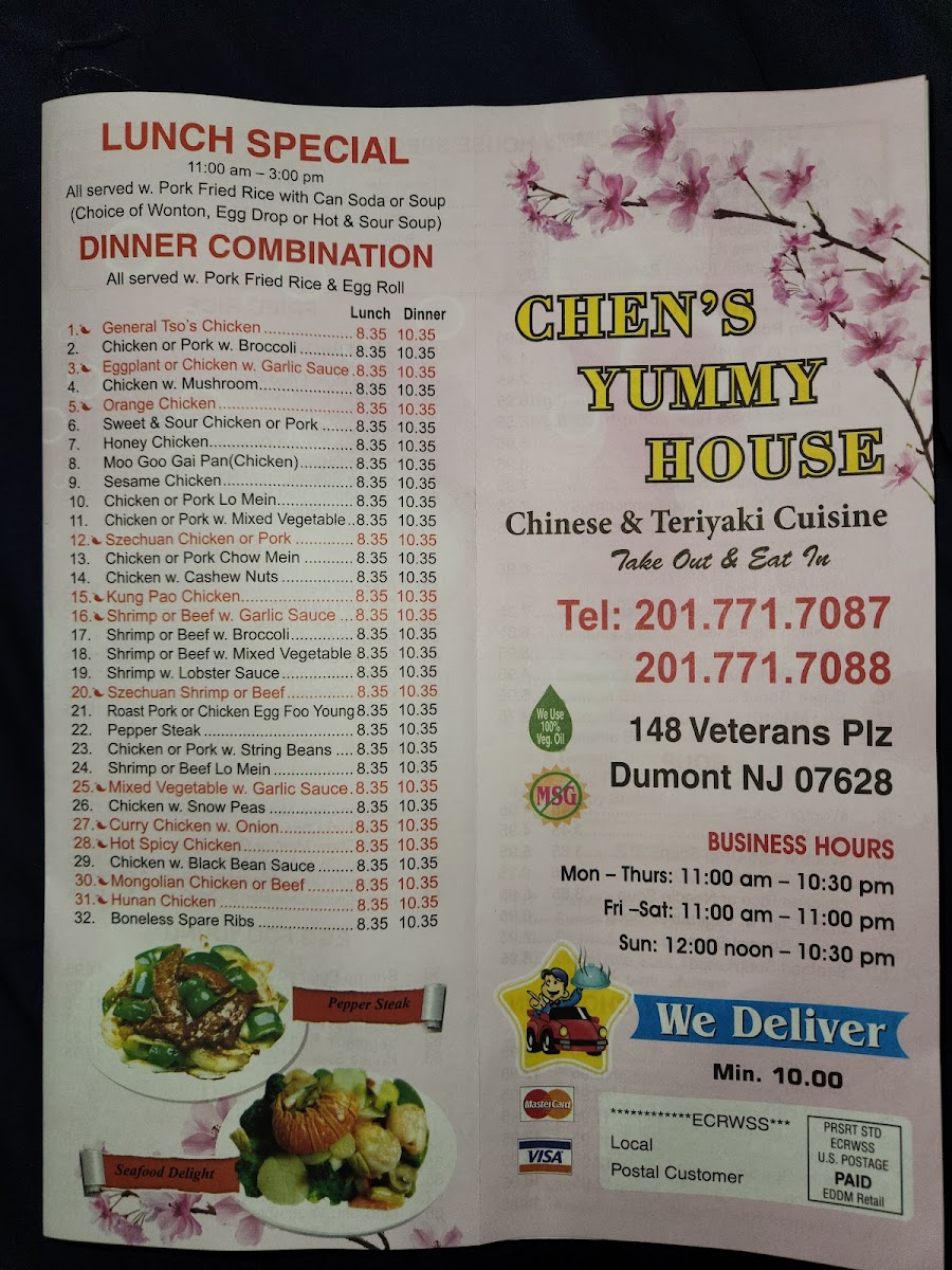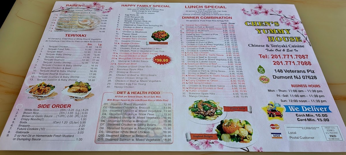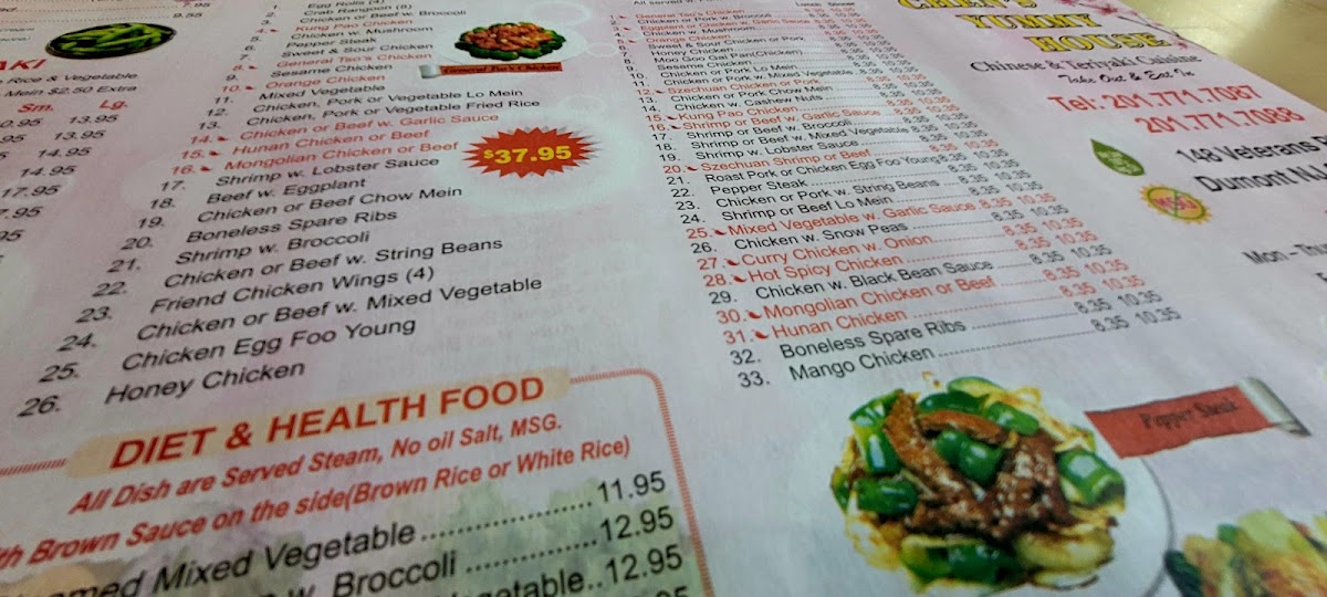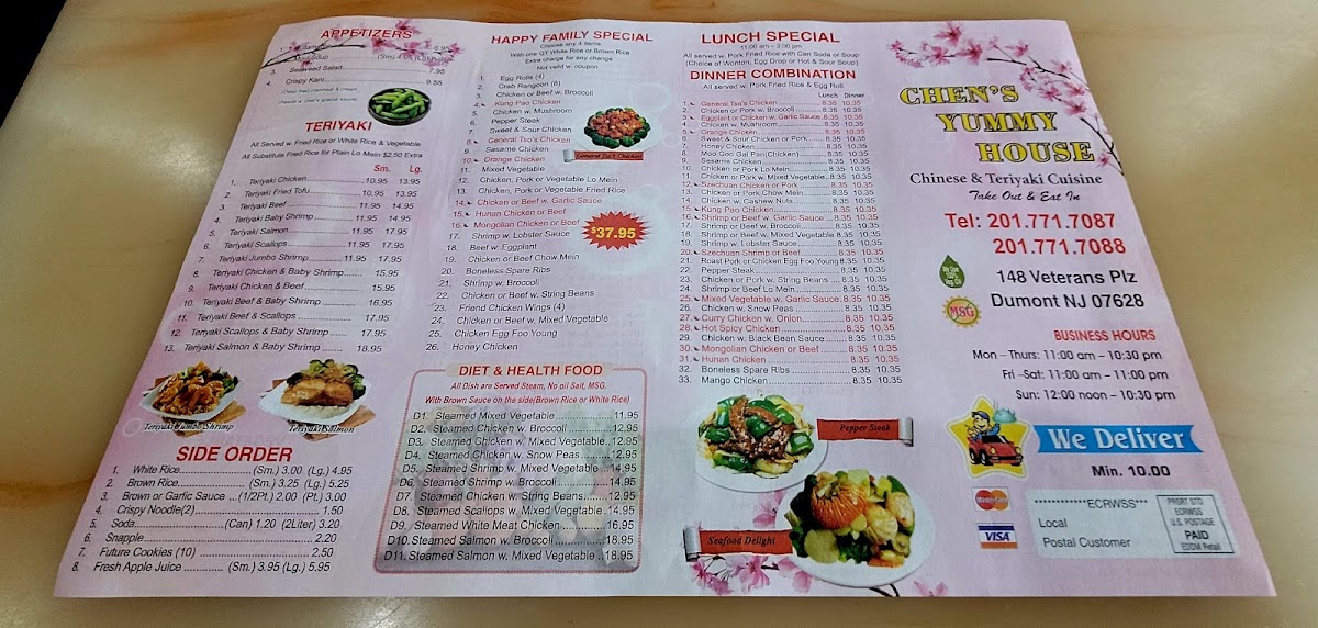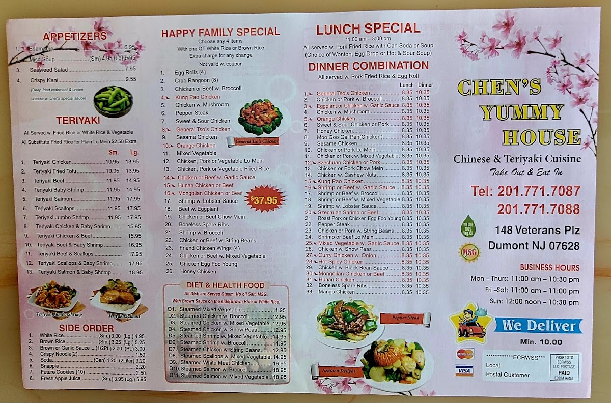 Chen's Yummy House in Dumont, NJ, offers an extensive and flavorful menu that caters to a variety of tastes, ranging from traditional Chinese dishes to Japanese-inspired appetizers. The menu is divided into several sections, including chicken, beef, seafood, egg foo young, fried rice, and noodle dishes, as well as healthier steamed options and delightful appetizers.