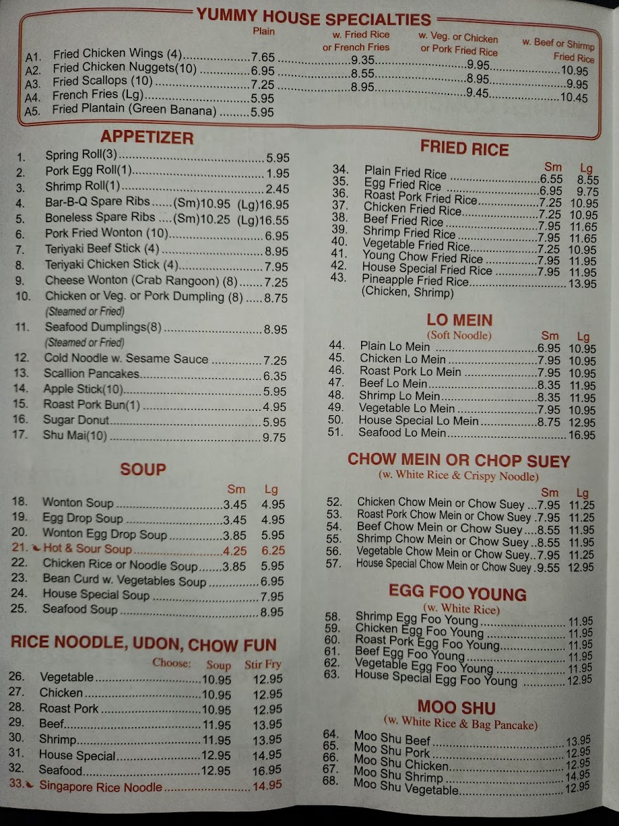 The menu also offers a variety of egg foo young options, such as the Shrimp Egg Foo Young and House Special Egg Foo Young, which are hearty and satisfying. Additionally, their Fried Rice selection is extensive, with choices like Chicken Fried Rice and Young Chow Fried Rice.