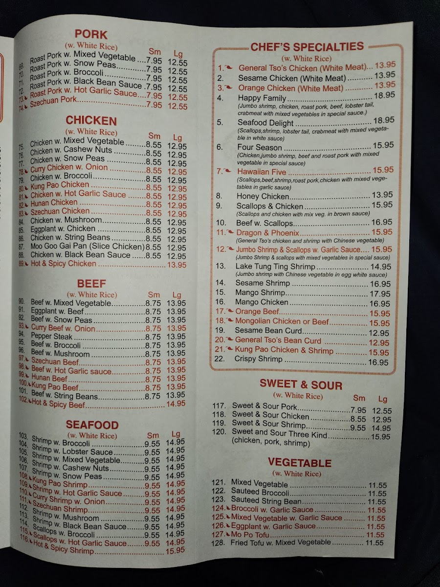 For those who enjoy a bit of spice, the Szechuan Chicken (Spicy) and Hunan Beef (Spicy) are top picks, each offering a bold and fiery kick. If you're craving something milder, the Chicken with Broccoli or Beef with Broccoli are classic options that never disappoint. The Sweet & Sour Three Kind and Sweet & Sour Chicken are perfect for those who prefer a balance of sweet and savory flavors.